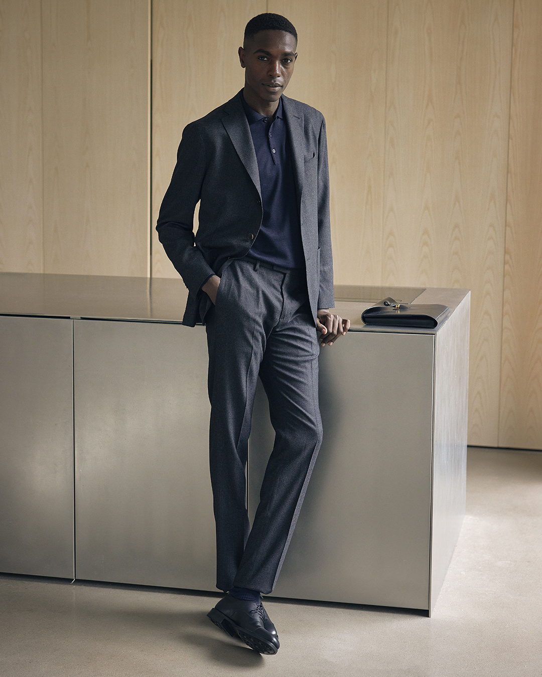 Sometime even just a shirt can feel cold under a blazer. The cotton is almost like cold paper on the skin and is perhaps more aesthetic than pleasant. The answer to this may be to choose a shirt in soft flannel, or even better – a finely knitted long-sleeved merino polo shirt from Italy’s Canali. This sweater is perfect paired with a suit or with a pair of wool trousers. Here we select a midnight blue variant, which works with most colour combinations. The contrast with a dark grey flannel suit is low, giving it an understated elegance and dressy feel.