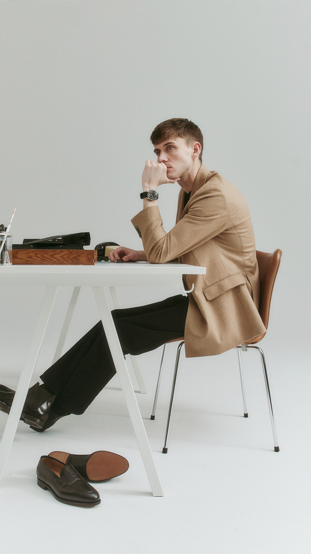 The double-breasted blazer from Oscar Jacobson in classic camel wool, brings classic tailoring into contemporary style. The jacket makes the perfect partner in an otherwise all black monochrome ensemble. Wearing it you are ready to close substantial client deals, or just embrace a more tailored, still laid back approach to everyday life. Altogether, you are still appropriately dressed for casual hangouts with friends after work. Details like a good watch and premium level shoes enhance the impression that you know what you are doing, business-wise as well as style-wise.