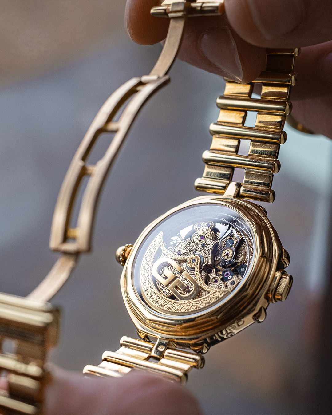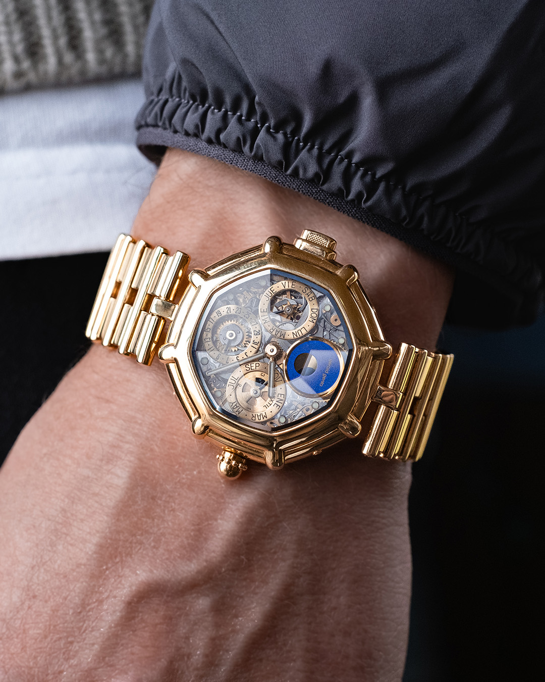 Currently, I own only one watch privately, as I have gradually sold almost everything else to finance the business. The watch is a Blancpain reference 5335 in yellow gold. It's an extremely interesting and rare model that went unnoticed until fairly recently. In fact, I acquired this watch by trading a modern Rolex Daytona directly for it. The watch features a beautiful cream-colored dial with a fantastic movement. A special detail is that the case was made by the legendary case maker Jean-Pierre Hagmann.